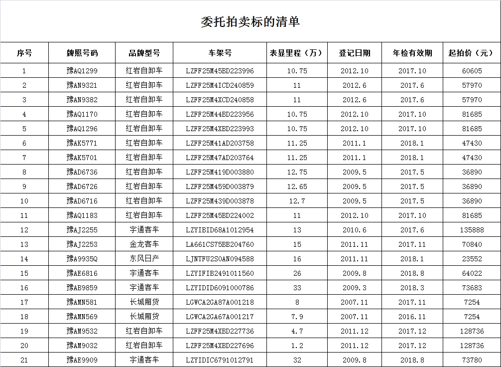 受委托,我行定于20182月(yuè)(yuè)2日星期五上(shàng)午10時(shí)30分(fēn),在鄭州拍賣總行拍賣廳(桐柏路(lù)與隴海路(lù)交叉口東南(nán)角金(jīn)中環B32層)舉行拍賣活動 ,公開拍賣:整體(tǐ)拍賣機動車21輛(紅(hóng)岩重型自卸貨車13輛、宇通大型客車4輛、金(jīn)龍大型客車1輛、長城輕型箱式貨車2輛、東風(fēng)輕型貨車1輛)